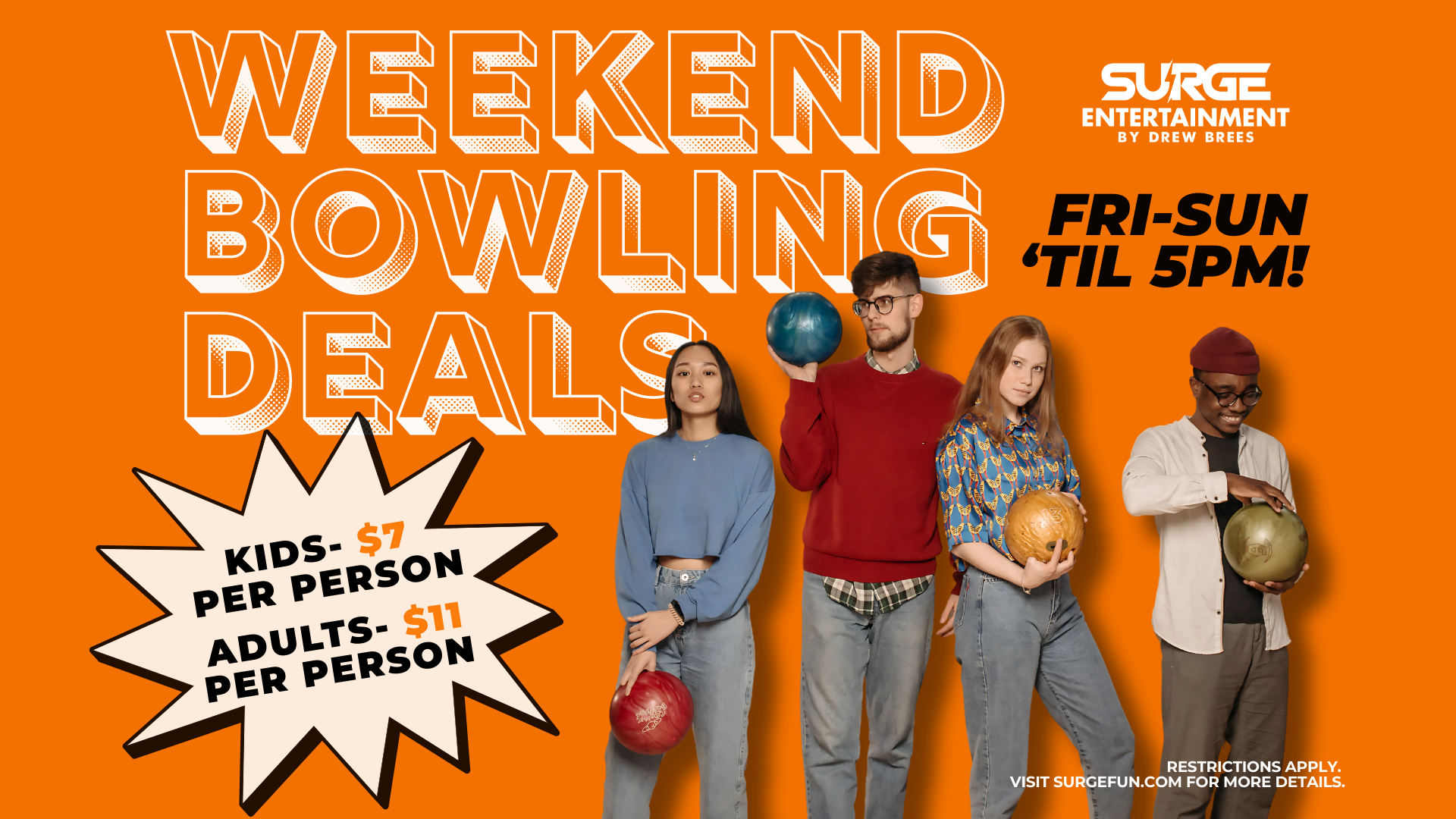 Weekends just got better—bowl for only $7 per kid and $11 per adult (includes shoes) every Saturday & Sunday from open to 3PM, only at Surge Entertainment!